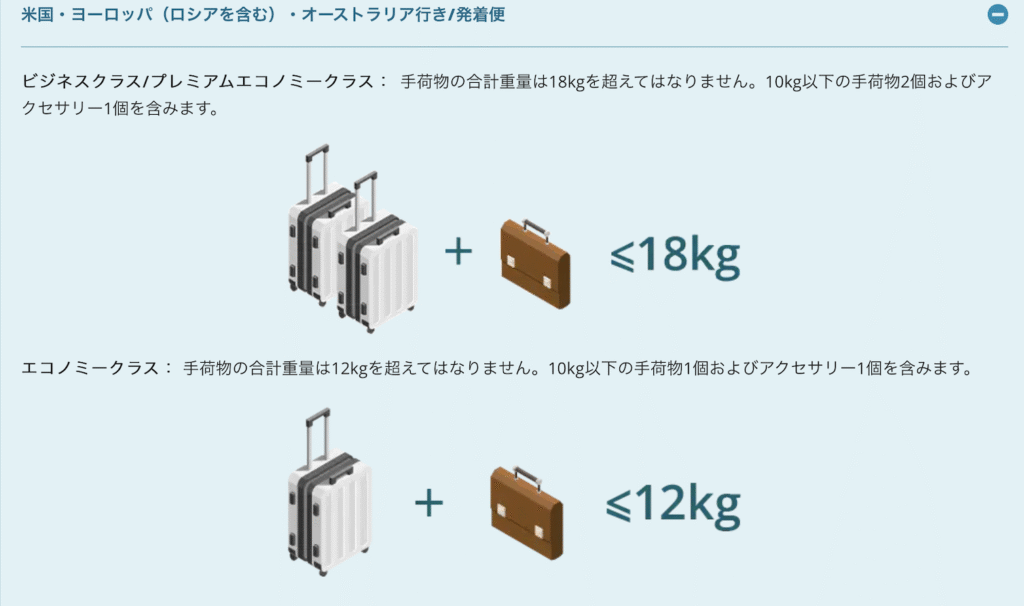 各航空会社は無料で持ち込める荷物の個数、重さを路線や座席クラスごとに決めています。